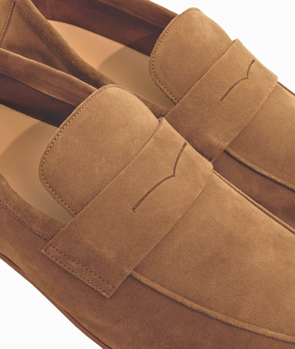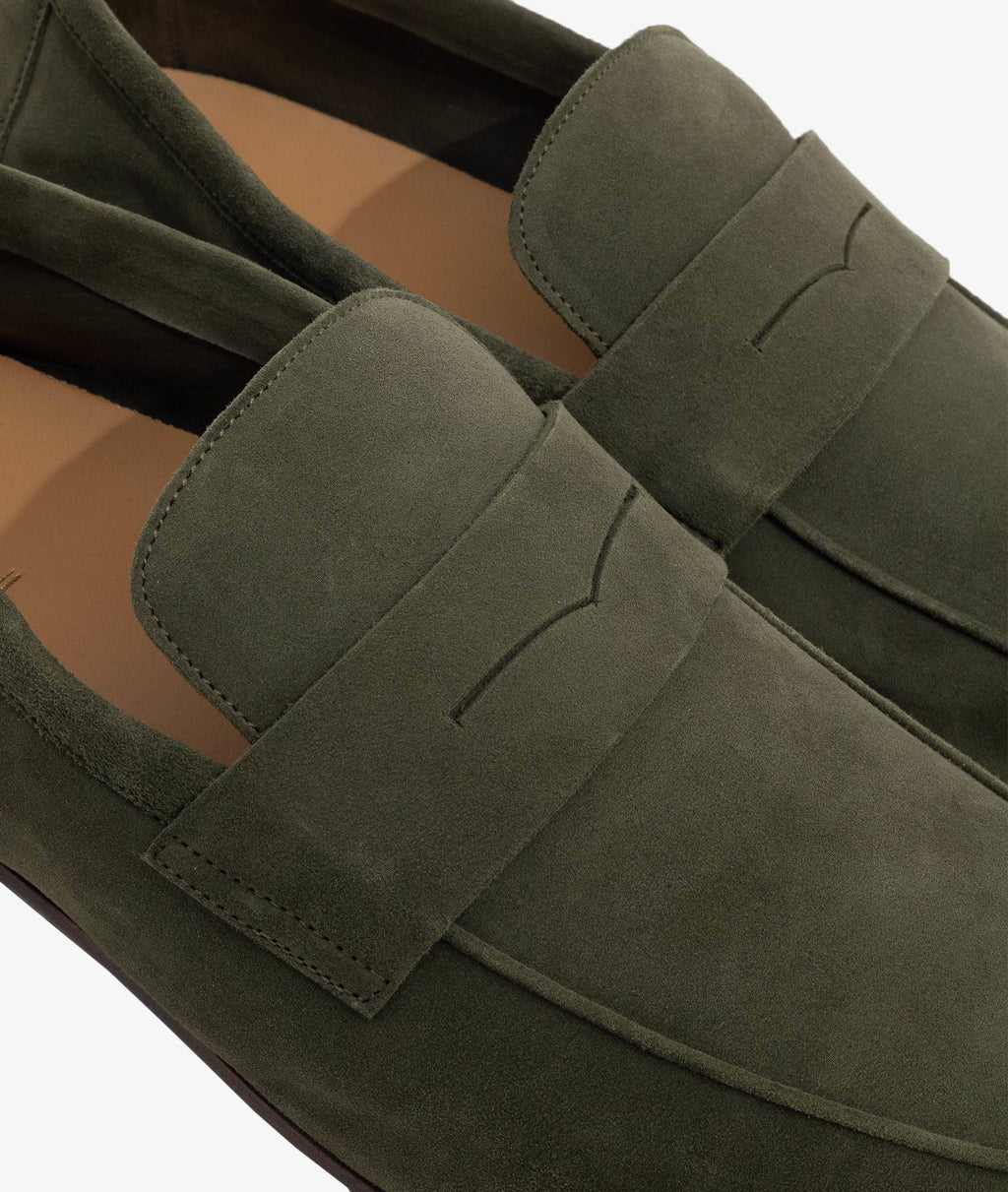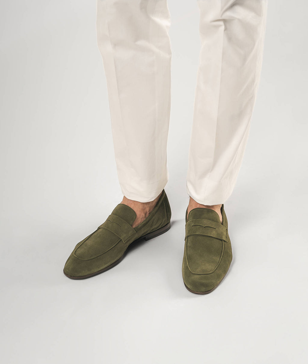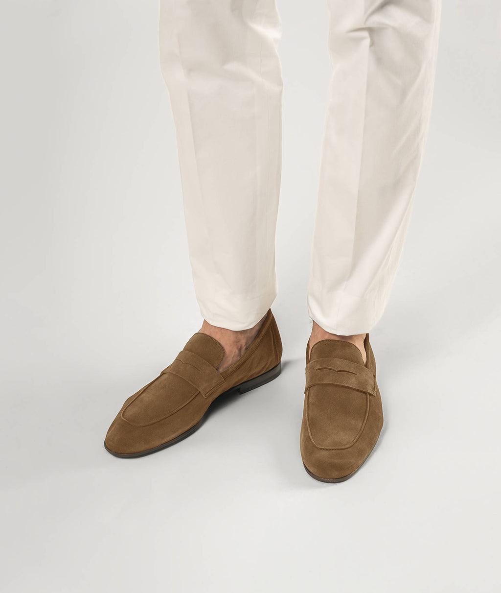 Loafer made of suede calf leather, handcrafted to combine elegance and comfort. The leather sole, flexible and durable, is embellished with the Larusmiani logo, while the front strap, inspired by the silhouette of a seagull, adds a distinctive touch of refinement and style.
